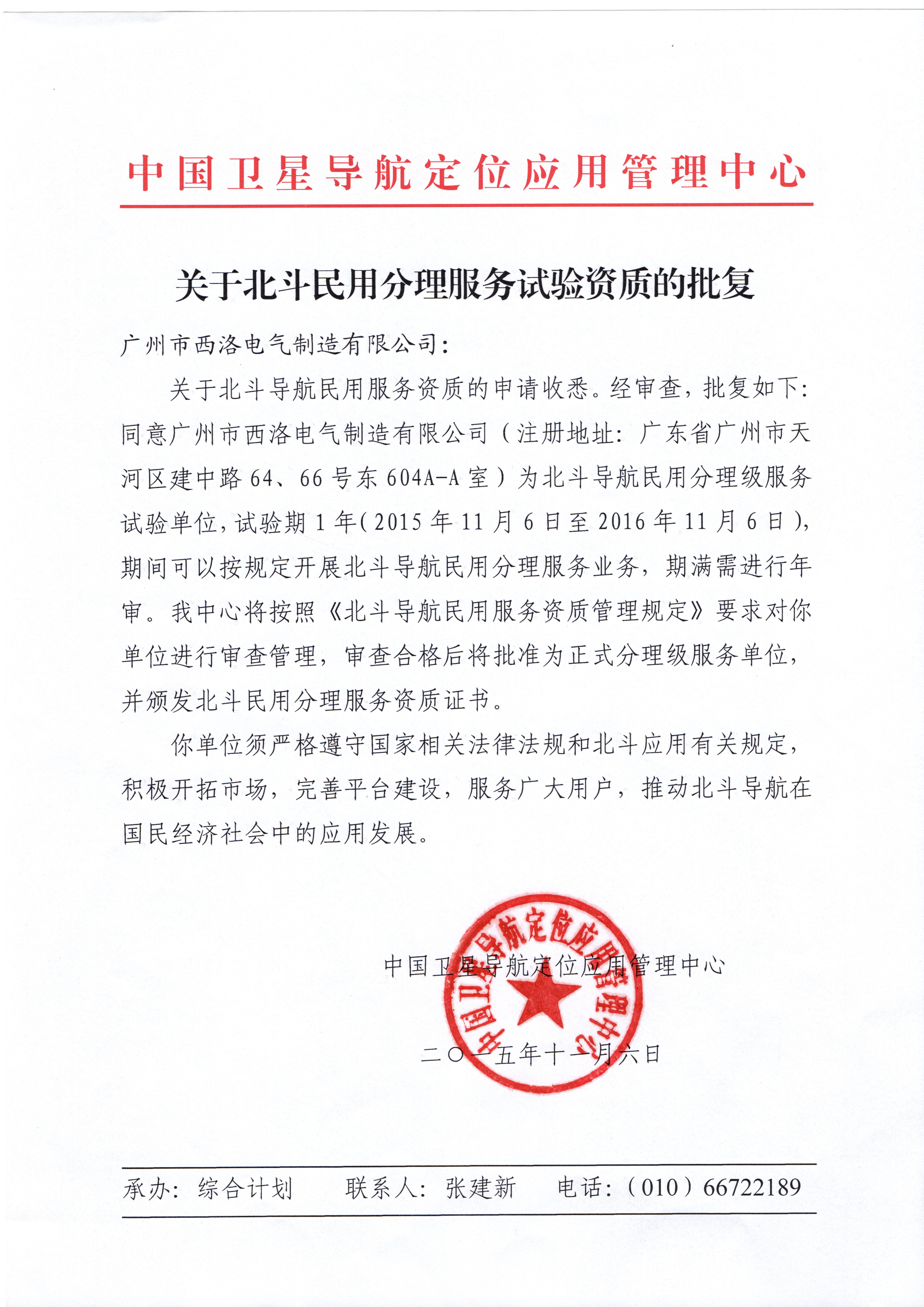 产品名称: 关于北斗民用分理服务试验资质的批复 |